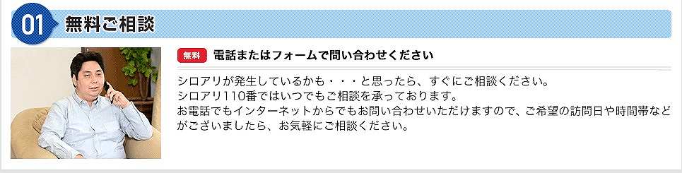 あくまで電話で相談するだけで契約をしなくても問題ありません。「シロアリ110番」のコールセンターのスタッフは対応が丁寧だという口コミばかりなので、安心してお電話してください。