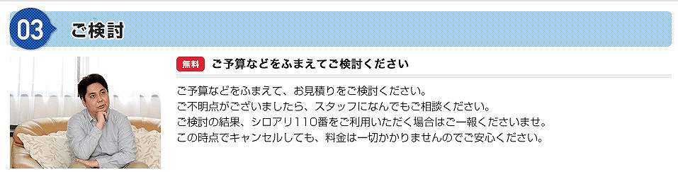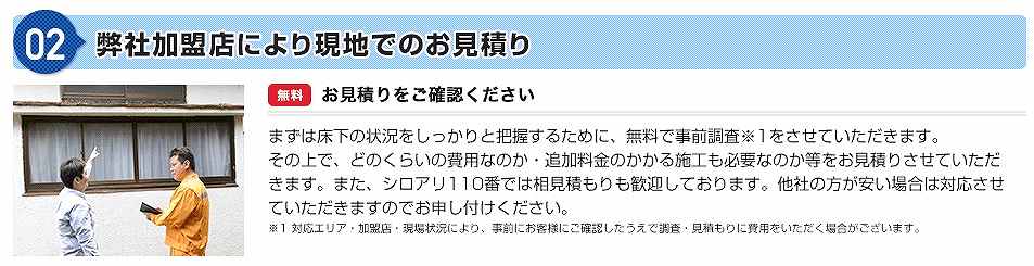ここまでの「シロアリ110番」とのやり取りは、全て無料でできますし、見積後のキャンセルも無料なので、問題があれば「自由」にキャンセルしてください。