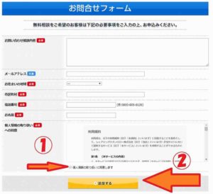 フォームに正しく入力したら、下にある②の「送信する」をクリックしていいただければ、「シロアリ110番」から返信が来ます。